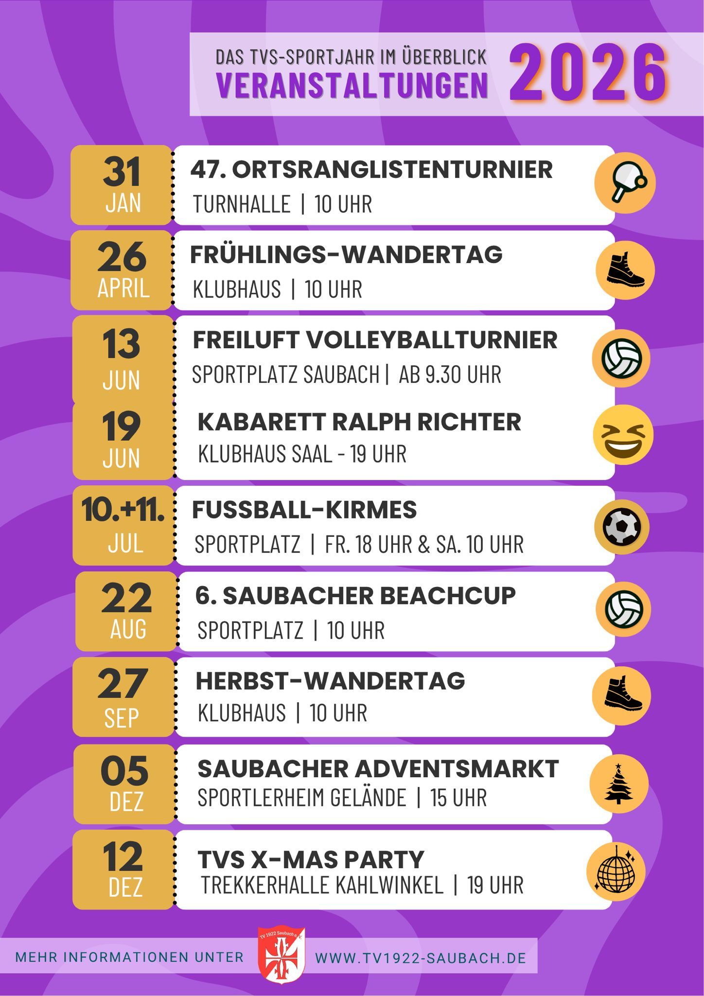Freut euch neben dem allgemeinen Freizeit-und Punktspielbetrieb erneut auf beliebte Sport-Events, ein Kabarett-Event im Juni sowie die gemeinsame XMAS-Party im Dezember! Den Anfang macht unser traditionelles Tischtennis-Ortsranglistenturnier am 31. Januar.