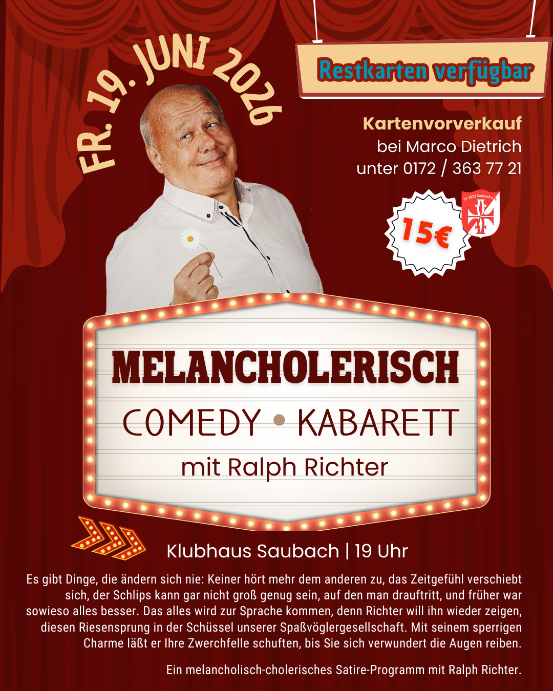 Ralph Richter ist zurück & tut es ein weiteres Mal: Großangriff auf eure Lachmuskeln mit seinem neuen Programm MELANCHOLERISCH - Freitag, 19. Juni 2026 im Klubhaus Saubach!